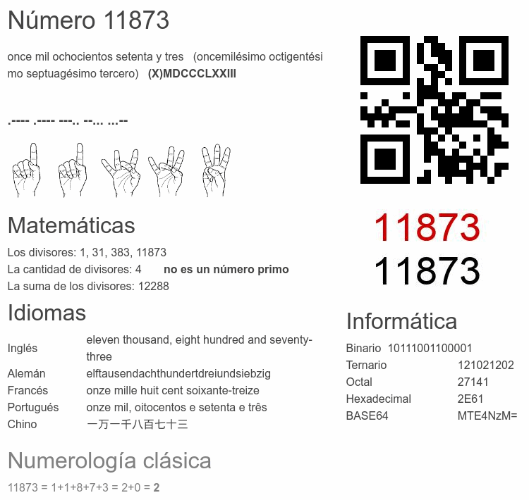 | Portugués: | 🔊 (número 11 873) | onze mil, oitocentos e setenta e três |