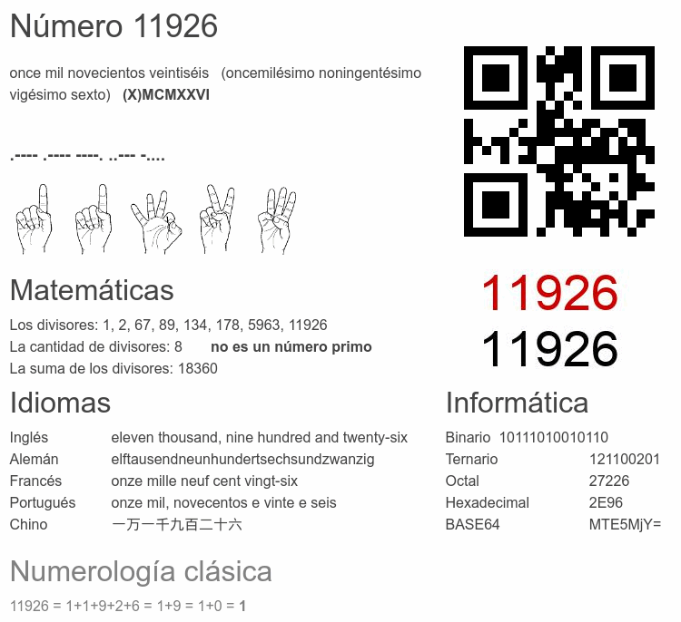 Si conoce algo interesante sobre el número 11926 o cualquier número natural (entero positivo), por favor escríbanos.Número 11 926 en otras unidades