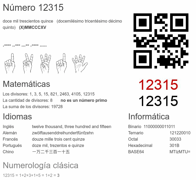 El número impar 12 315 se dice 🔊, y se escribe con las palabras: doce mil trescientos quince. El número ordinal 12315.° se dice 🔊 y se escribe como: docemilésimo tricentésimo décimo quinto. El significado del número 12315 en Matemáticas: Es un primo? Factorización y árbol de factores primos. La raíz cuadrada de y la raíz cúbica de 12315. El significado en informática, numerología, códigos e imágenes, escritura y denominación en otras lenguas. Otras curiosidades relacionadas con el 12315.