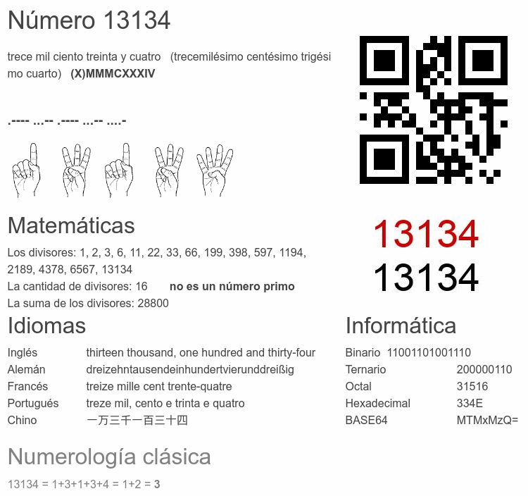 Si conoce algo interesante sobre el número 13134 o cualquier número natural (entero positivo), por favor escríbanos.Número 13 134 en otras unidades