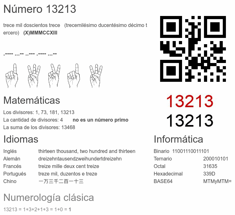 El número impar 13 213 se dice 🔊, y se escribe con las palabras: trece mil doscientos trece. El número ordinal 13213.° se dice 🔊 y se escribe como: trecemilésimo ducentésimo décimo tercero. El significado del número 13213 en Matemáticas: Es un primo? Factorización y árbol de factores primos. La raíz cuadrada de y la raíz cúbica de 13213. El significado en informática, numerología, códigos e imágenes, escritura y denominación en otras lenguas. Otras curiosidades relacionadas con el 13213.