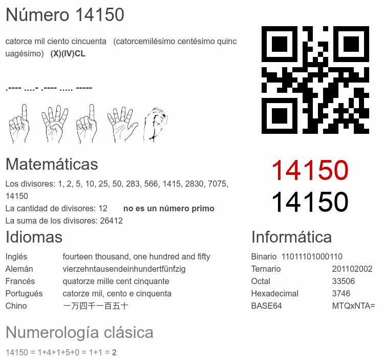 El número par 14 150 se dice 🔊, y se escribe con las palabras: catorce mil ciento cincuenta. El número ordinal 14150.° se dice 🔊 y se escribe como: catorcemilésimo centésimo quincuagésimo. El significado del número 14150 en Matemáticas: Es un primo? Factorización y árbol de factores primos. La raíz cuadrada de y la raíz cúbica de 14150. El significado en informática, numerología, códigos e imágenes, escritura y denominación en otras lenguas. Otras curiosidades relacionadas con el 14150.