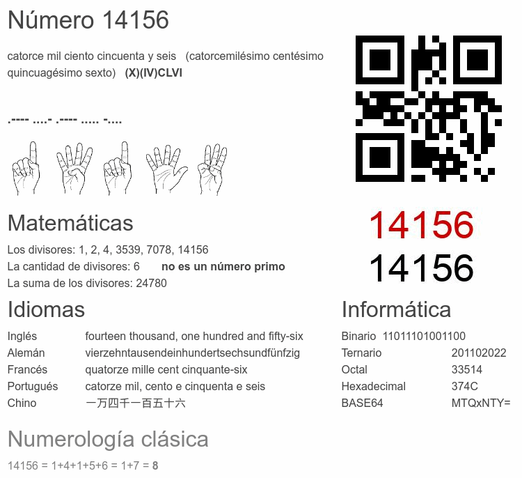 Si conoce algo interesante sobre el número 14156 o cualquier número natural (entero positivo), por favor escríbanos.Número 14 156 en otras unidades