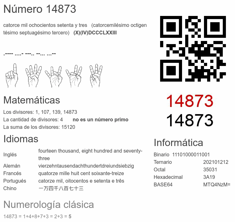 | Portugués: | 🔊 (número 14 873) | catorze mil, oitocentos e setenta e três |