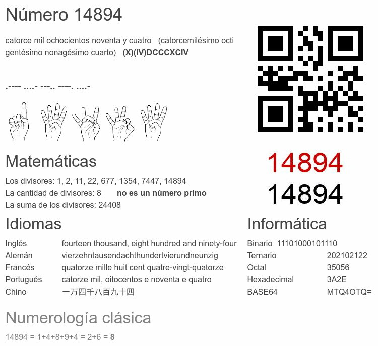 Si conoce algo interesante sobre el número 14894 o cualquier número natural (entero positivo), por favor escríbanos.Número 14 894 en otras unidades