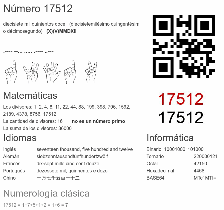 Si conoce algo interesante sobre el número 17512 o cualquier número natural (entero positivo), por favor escríbanos.Número 17 512 en otras unidades