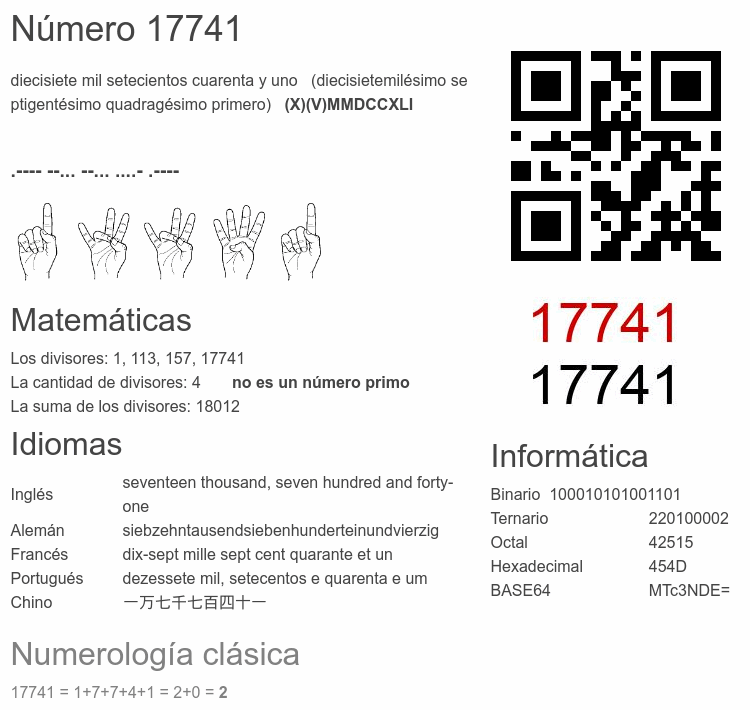 Si conoce algo interesante sobre el número 17741 o cualquier número natural (entero positivo), por favor escríbanos.Número 17 741 en otras unidades