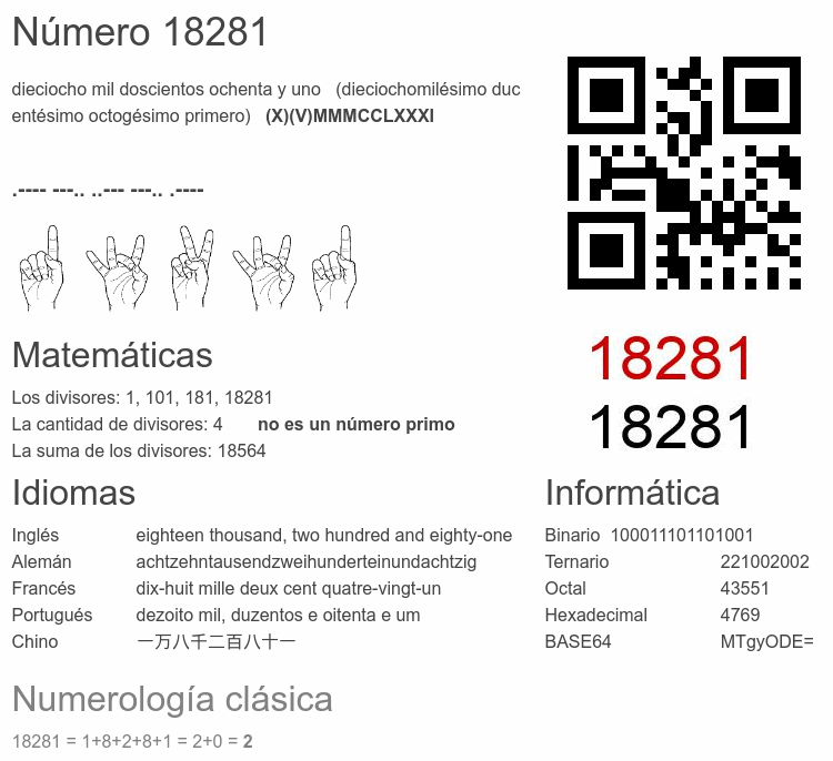 Número 18281 en el código morse: .---- ---.. ..--- ---.. .----Lengua de Signos Española 18281:
