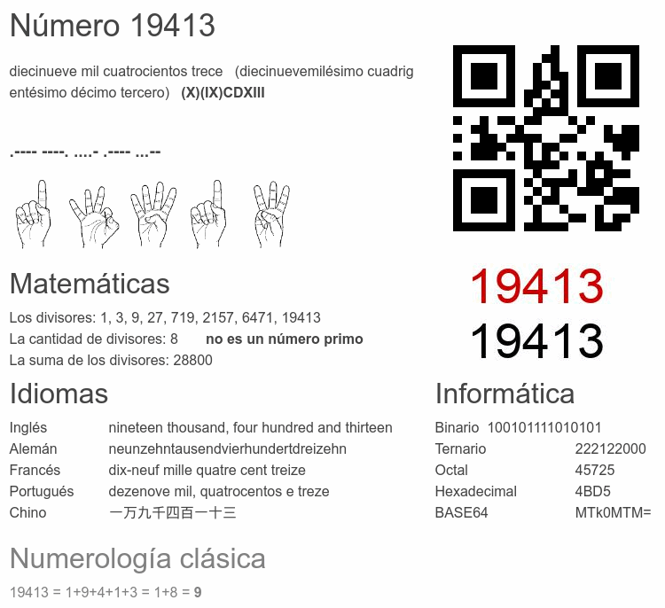 Si conoce algo interesante sobre el número 19413 o cualquier número natural (entero positivo), por favor escríbanos.Número 19 413 en otras unidades