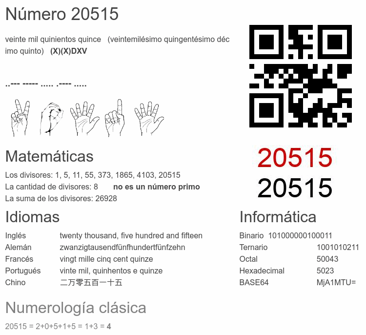Si conoce algo interesante sobre el número 20515 o cualquier número natural (entero positivo), por favor escríbanos.Número 20 515 en otras unidades