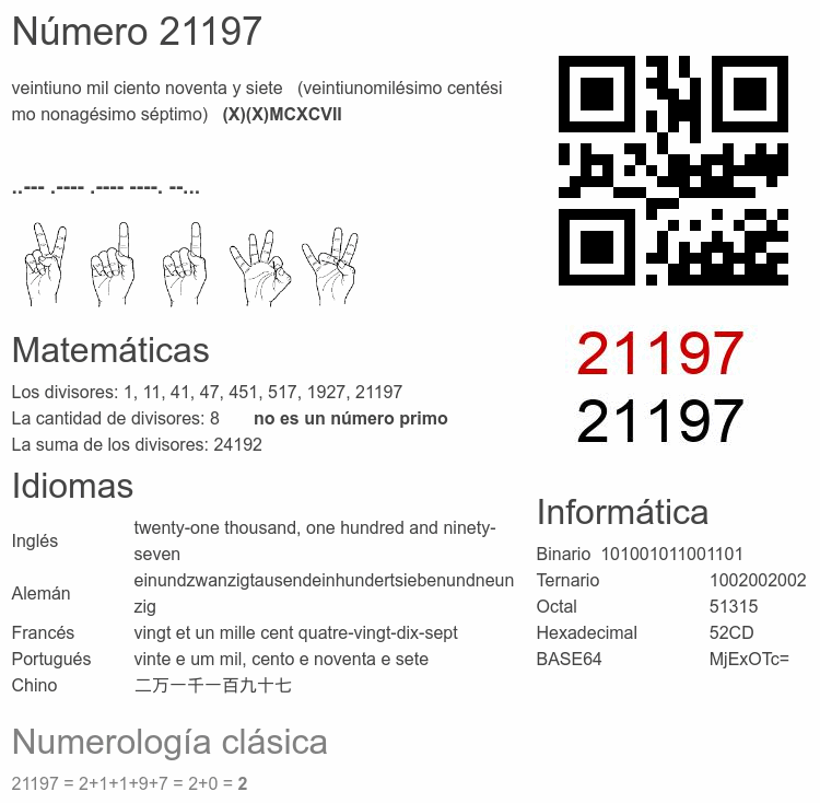 Si conoce algo interesante sobre el número 21197 o cualquier número natural (entero positivo), por favor escríbanos.Número 21 197 en otras unidades