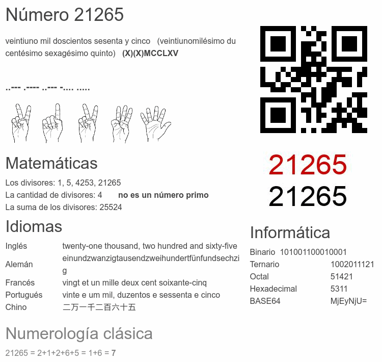 Si conoce algo interesante sobre el número 21265 que no ha encontrado en esta página, no dude en escríbanos aqui.