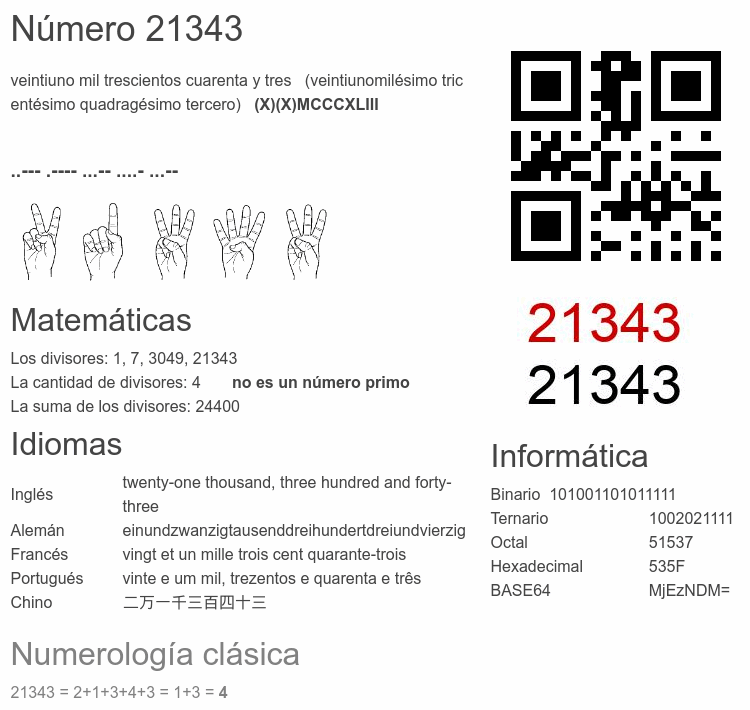 Si conoce algo interesante sobre el número 21343 o cualquier número natural (entero positivo), por favor escríbanos.Número 21 343 en otras unidades