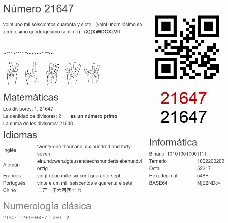 Si conoce algo interesante sobre el número 21647 o cualquier número natural (entero positivo), por favor escríbanos.Número 21 647 en otras unidades