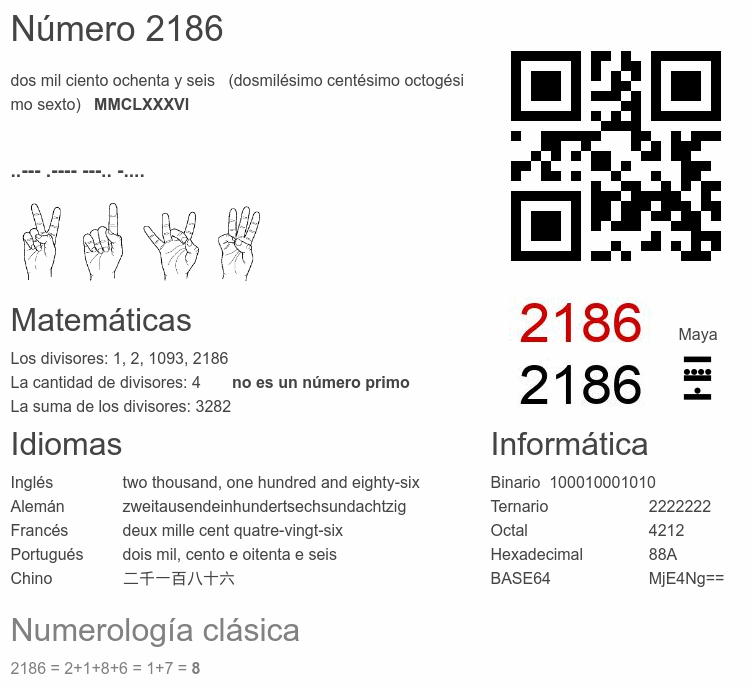 El número par 2 186 se dice 🔊, y se escribe con las palabras: dos mil ciento ochenta y seis. El número ordinal 2186.° se dice 🔊 y se escribe como: dosmilésimo centésimo octogésimo sexto. El significado del número 2186 en Matemáticas: Es un primo? Factorización y árbol de factores primos. La raíz cuadrada de y la raíz cúbica de 2186. El significado en informática, numerología, códigos e imágenes, escritura y denominación en otras lenguas. Otras curiosidades, vídeos, noticias relacionadas con el 2186.