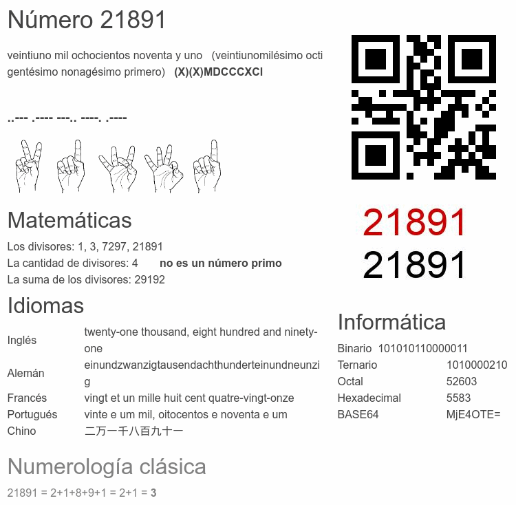 Si conoce algo interesante sobre el número 21891 o cualquier número natural (entero positivo), por favor escríbanos.Número 21 891 en otras unidades