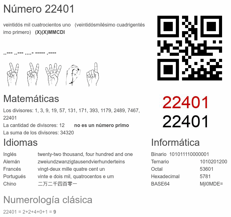 | Portugués: | 🔊 (número 22 401) | vinte e dois mil, quatrocentos e um |