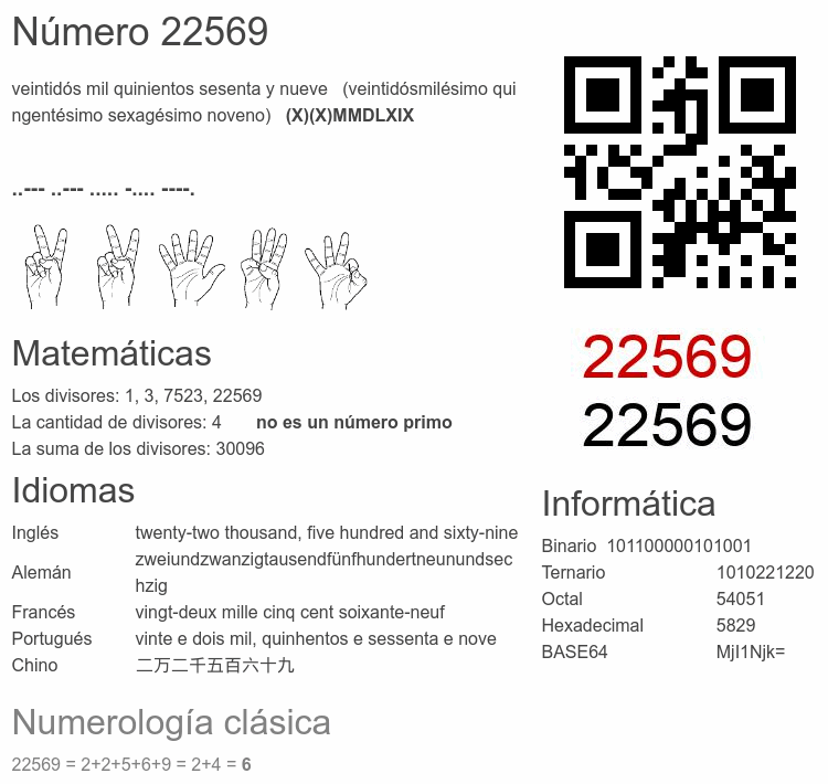 Si conoce algo interesante sobre el número 22569 o cualquier número natural (entero positivo), por favor escríbanos.Número 22 569 en otras unidades