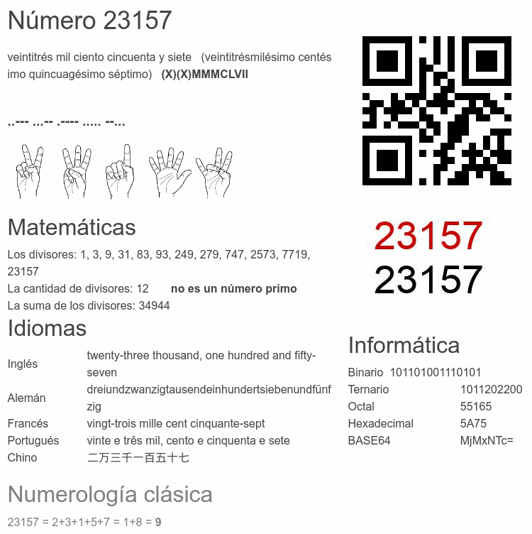 Si conoce algo interesante sobre el número 23157 que no ha encontrado en esta página, no dude en escríbanos aqui.