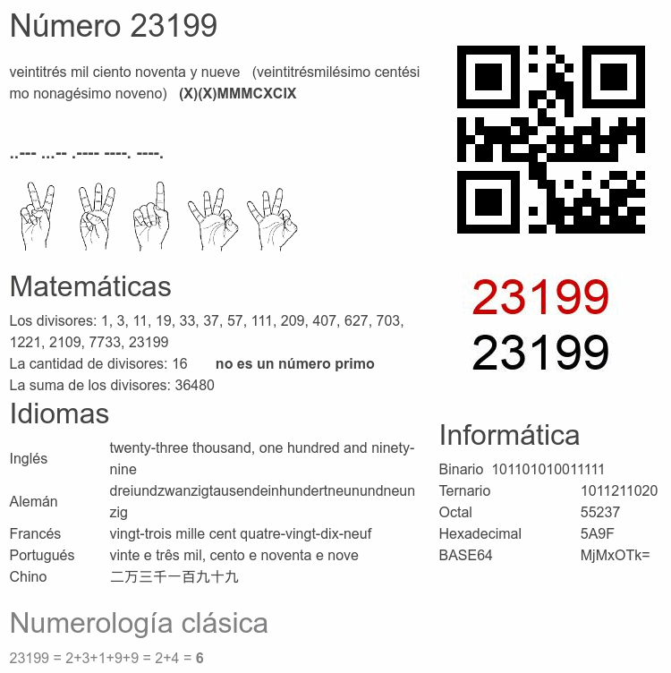 Si conoce algo interesante sobre el número 23199 o cualquier número natural (entero positivo), por favor escríbanos.Número 23 199 en otras unidades