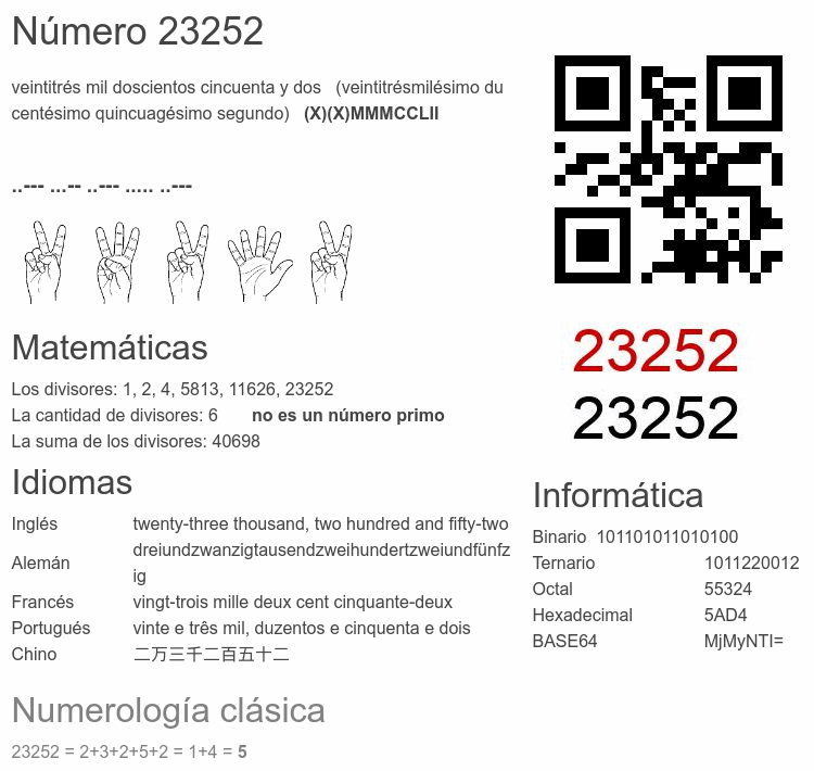 El número par 23 252 se dice 🔊, y se escribe con las palabras: veintitrés mil doscientos cincuenta y dos. El número ordinal 23252.° se dice 🔊 y se escribe como: veintitrésmilésimo ducentésimo quincuagésimo segundo. El significado del número 23252 en Matemáticas: Es un primo? Factorización y árbol de factores primos. La raíz cuadrada de y la raíz cúbica de 23252. El significado en informática, numerología, códigos e imágenes, escritura y denominación en otras lenguas. Otras curiosidades relacionadas con el 23252.