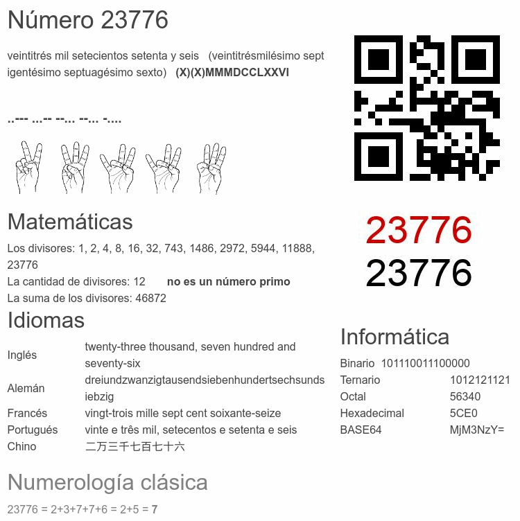 Si conoce algo interesante sobre el número 23776 o cualquier número natural (entero positivo), por favor escríbanos.Número 23 776 en otras unidades