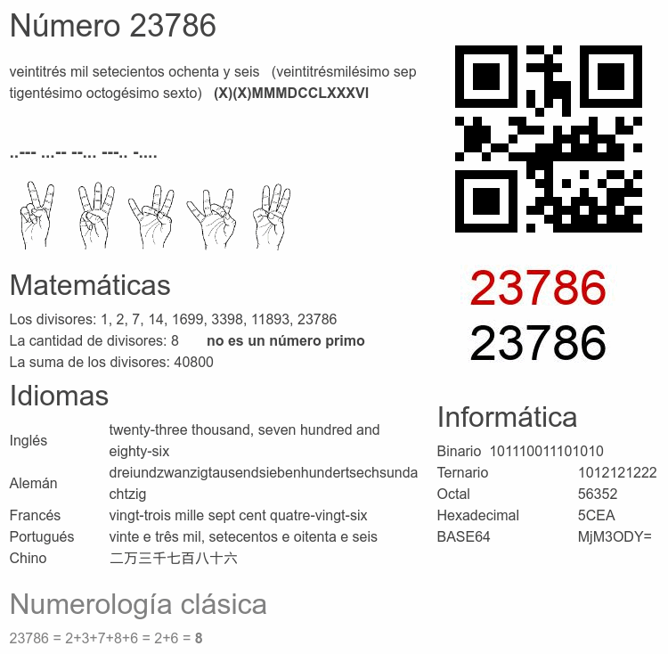 Si conoce algo interesante sobre el número 23786 o cualquier número natural (entero positivo), por favor escríbanos.Número 23 786 en otras unidades