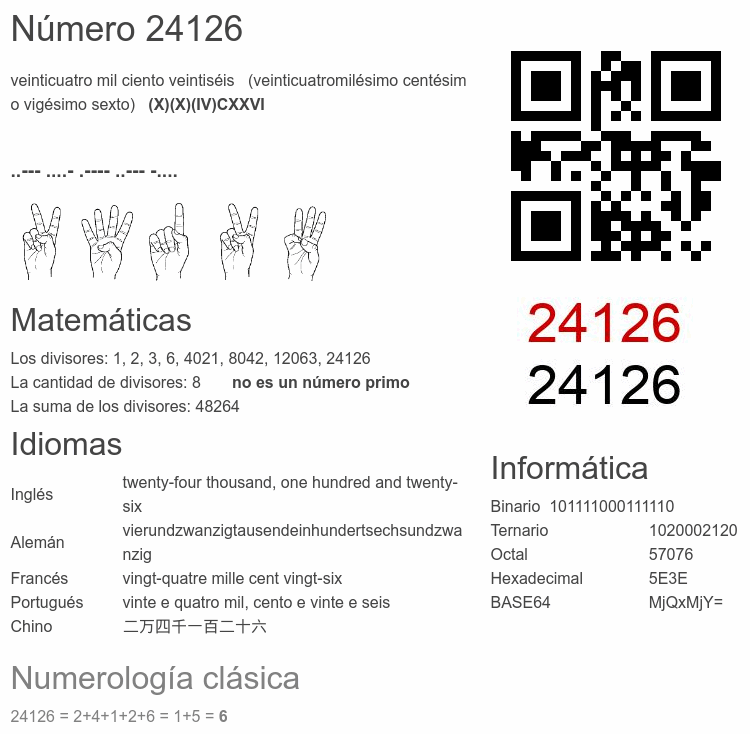 Si conoce algo interesante sobre el número 24126 o cualquier número natural (entero positivo), por favor escríbanos.Número 24 126 en otras unidades