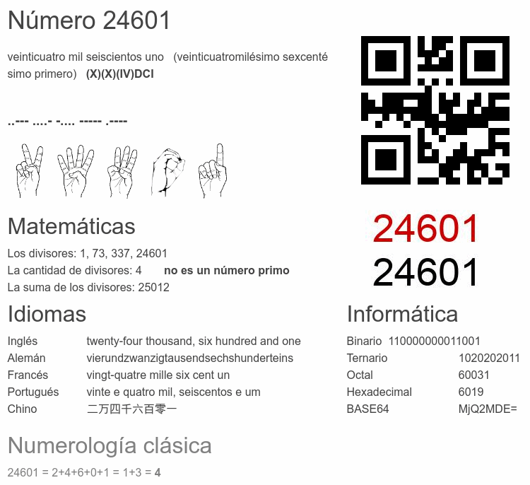Si conoce algo interesante sobre el número 24601 o cualquier número natural (entero positivo), por favor escríbanos.Número 24 601 en otras unidades