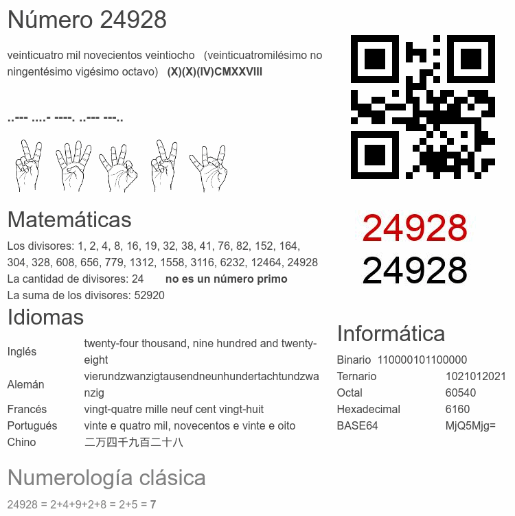 Si conoce algo interesante sobre el número 24928 o cualquier número natural (entero positivo), por favor escríbanos.Número 24 928 en otras unidades