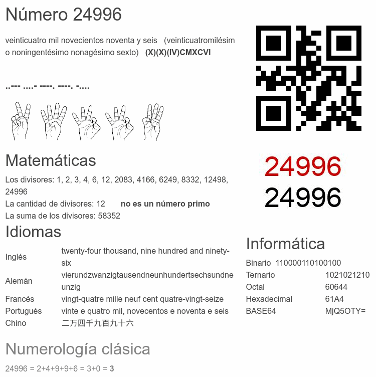 Si conoce algo interesante sobre el número 24996 o cualquier número natural (entero positivo), por favor escríbanos.Número 24 996 en otras unidades
