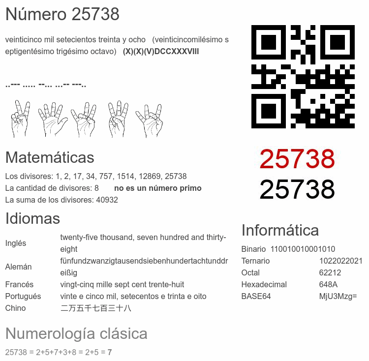 El número par 25 738 se dice 🔊, y se escribe con las palabras: veinticinco mil setecientos treinta y ocho. El número ordinal 25738.° se dice 🔊 y se escribe como: veinticincomilésimo septigentésimo trigésimo octavo. El significado del número 25738 en Matemáticas: Es un primo? Factorización y árbol de factores primos. La raíz cuadrada de y la raíz cúbica de 25738. El significado en informática, numerología, códigos e imágenes, escritura y denominación en otras lenguas. Otras curiosidades relacionadas con el 25738.