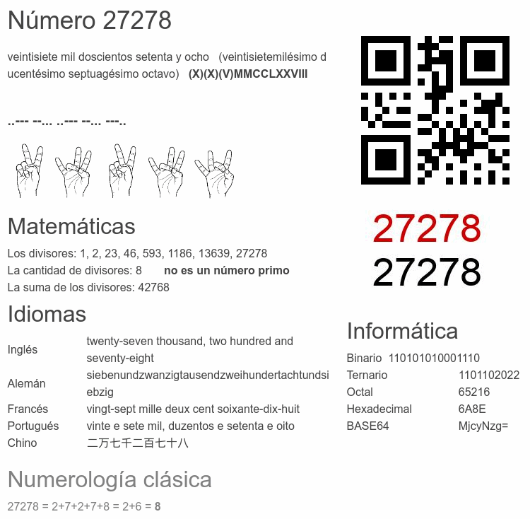 Si conoce algo interesante sobre el número 27278 o cualquier número natural (entero positivo), por favor escríbanos.Número 27 278 en otras unidades