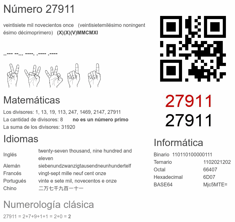 Si conoce algo interesante sobre el número 27911 que no ha encontrado en esta página, no dude en escríbanos aqui.