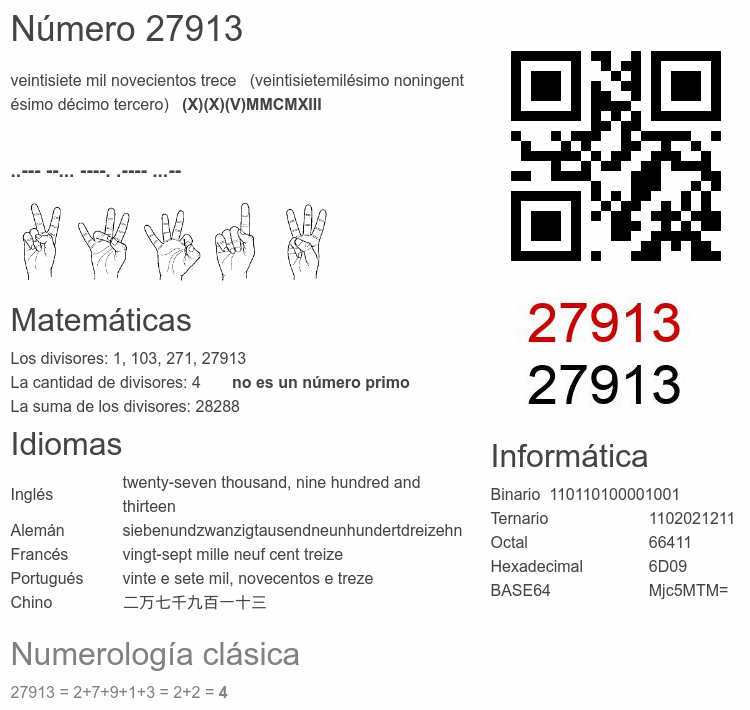 Si conoce algo interesante sobre el número 27913 o cualquier número natural (entero positivo), por favor escríbanos.Número 27 913 en otras unidades