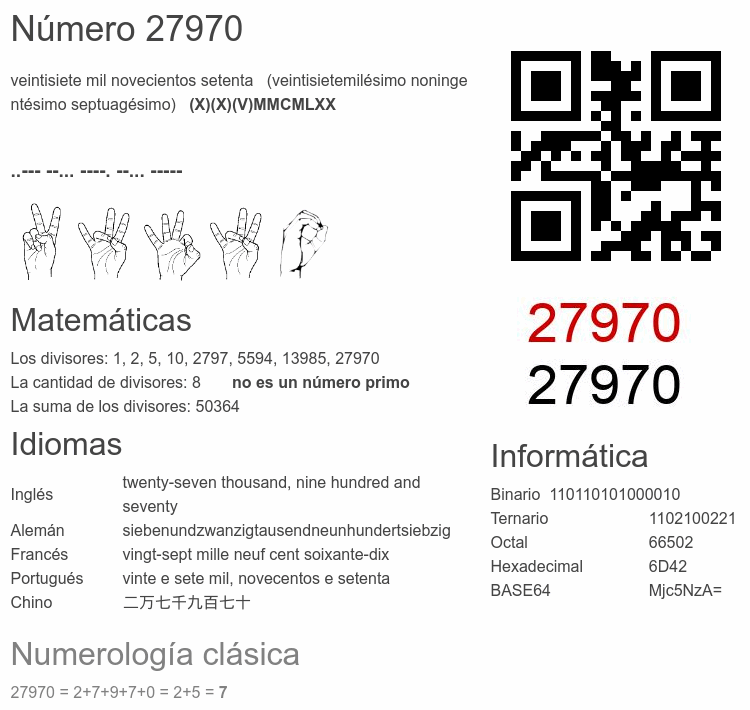 Si conoce algo interesante sobre el número 27970 o cualquier número natural (entero positivo), por favor escríbanos.Número 27 970 en otras unidades