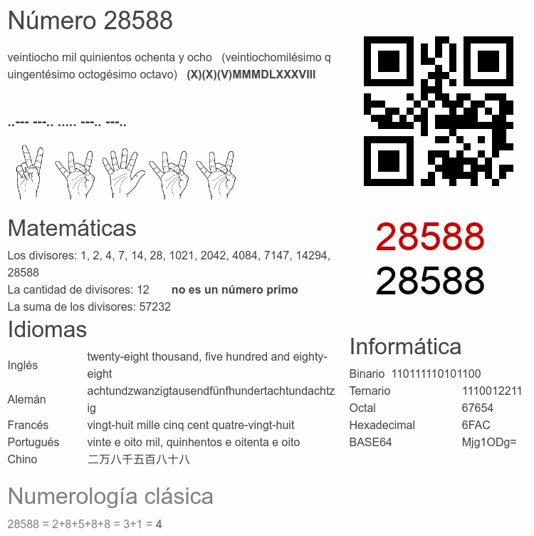 Si conoce algo interesante sobre el número 28588 o cualquier número natural (entero positivo), por favor escríbanos.Número 28 588 en otras unidades