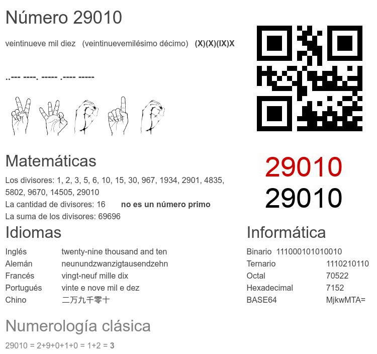 El número par 29 010 se dice 🔊, y se escribe con las palabras: veintinueve mil diez. El número ordinal 29010.° se dice 🔊 y se escribe como: veintinuevemilésimo décimo. El significado del número 29010 en Matemáticas: Es un primo? Factorización y árbol de factores primos. La raíz cuadrada de y la raíz cúbica de 29010. El significado en informática, numerología, códigos e imágenes, escritura y denominación en otras lenguas. Otras curiosidades relacionadas con el 29010.