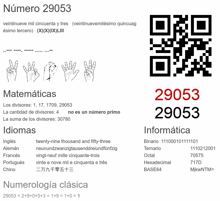 Si conoce algo interesante sobre el número 29053 o cualquier número natural (entero positivo), por favor escríbanos.Número 29 053 en otras unidades