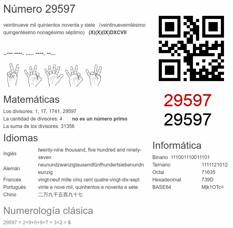 Si conoce algo interesante sobre el número 29597 o cualquier número natural (entero positivo), por favor escríbanos.Número 29 597 en otras unidades
