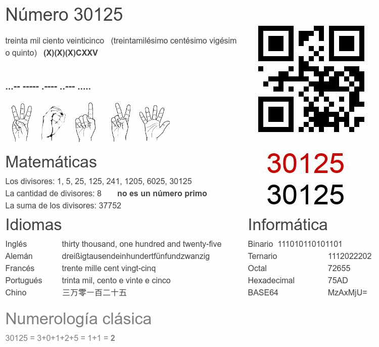 Si conoce algo interesante sobre el número 30125 o cualquier número natural (entero positivo), por favor escríbanos.Número 30 125 en otras unidades