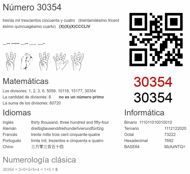 Si conoce algo interesante sobre el número 30354 o cualquier número natural (entero positivo), por favor escríbanos.Número 30 354 en otras unidades