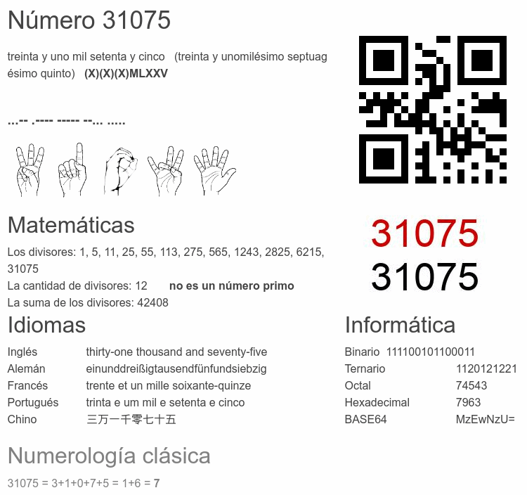 Si conoce algo interesante sobre el número 31075 o cualquier número natural (entero positivo), por favor escríbanos.Número 31 075 en otras unidades