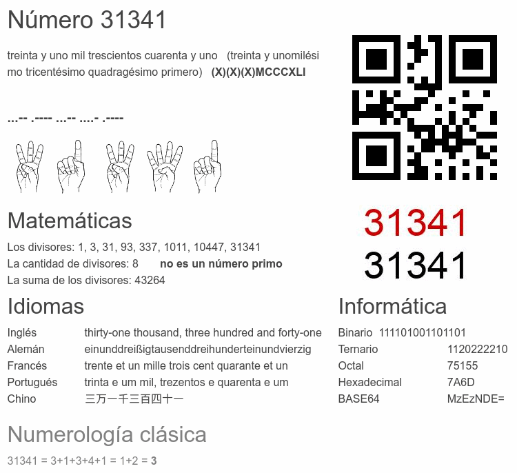 | Francés: | 🔊 (nombre 31 341) | trente et un mille trois cent quarante et un |