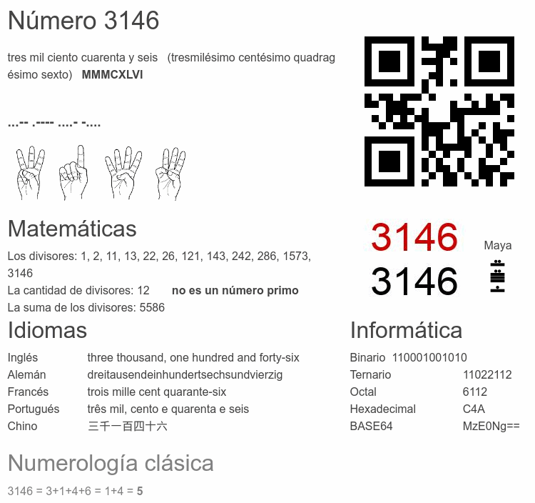 El número par 3 146 se dice 🔊, y se escribe con las palabras: tres mil ciento cuarenta y seis. El número ordinal 3146.° se dice 🔊 y se escribe como: tresmilésimo centésimo quadragésimo sexto. El significado del número 3146 en Matemáticas: Es un primo? Factorización y árbol de factores primos. La raíz cuadrada de y la raíz cúbica de 3146. El significado en informática, numerología, códigos e imágenes, escritura y denominación en otras lenguas. Otras curiosidades relacionadas con el 3146.