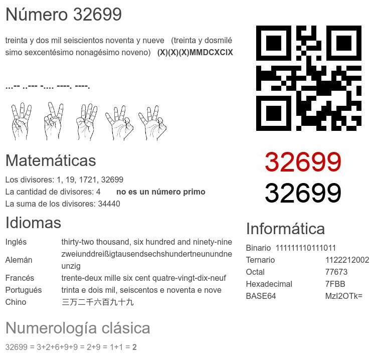 Si conoce algo interesante sobre el número 32699 o cualquier número natural (entero positivo), por favor escríbanos.Número 32 699 en otras unidades