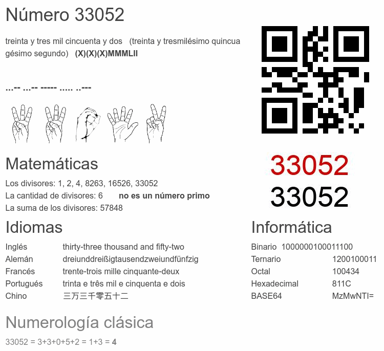 Si conoce algo interesante sobre el número 33052 o cualquier número natural (entero positivo), por favor escríbanos.Número 33 052 en otras unidades
