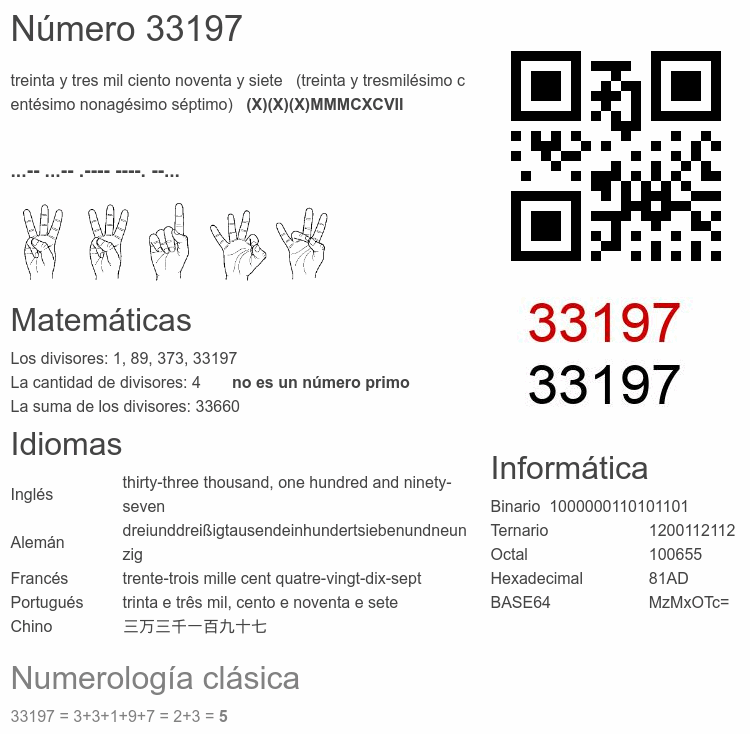 Si conoce algo interesante sobre el número 33197 o cualquier número natural (entero positivo), por favor escríbanos.Número 33 197 en otras unidades