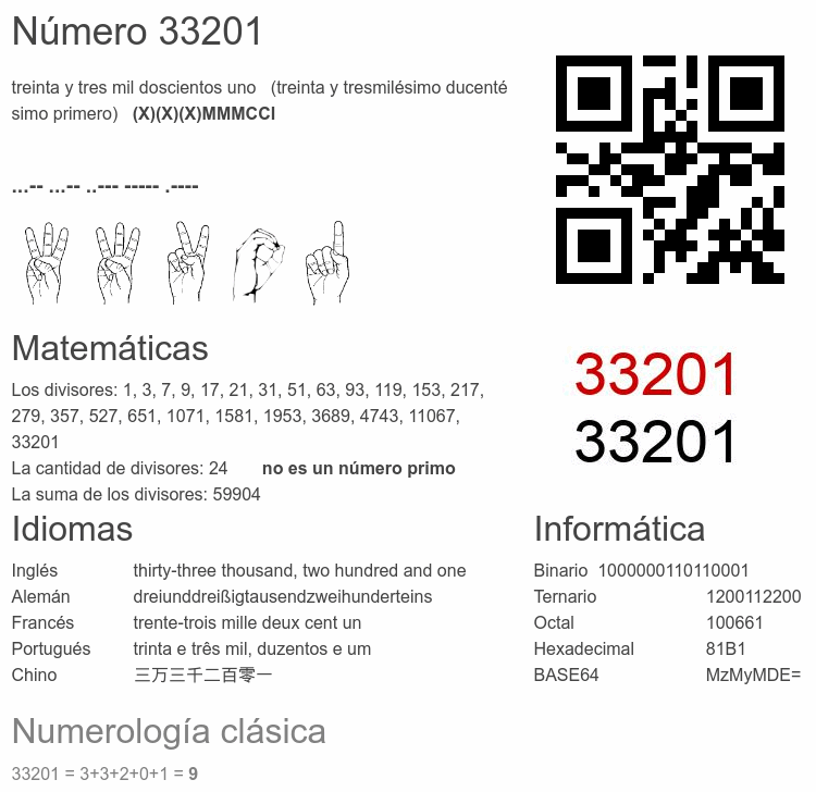 Si conoce algo interesante sobre el número 33201 o cualquier número natural (entero positivo), por favor escríbanos.Número 33 201 en otras unidades