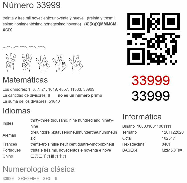 Si conoce algo interesante sobre el número 33999 o cualquier número natural (entero positivo), por favor escríbanos.Número 33 999 en otras unidades